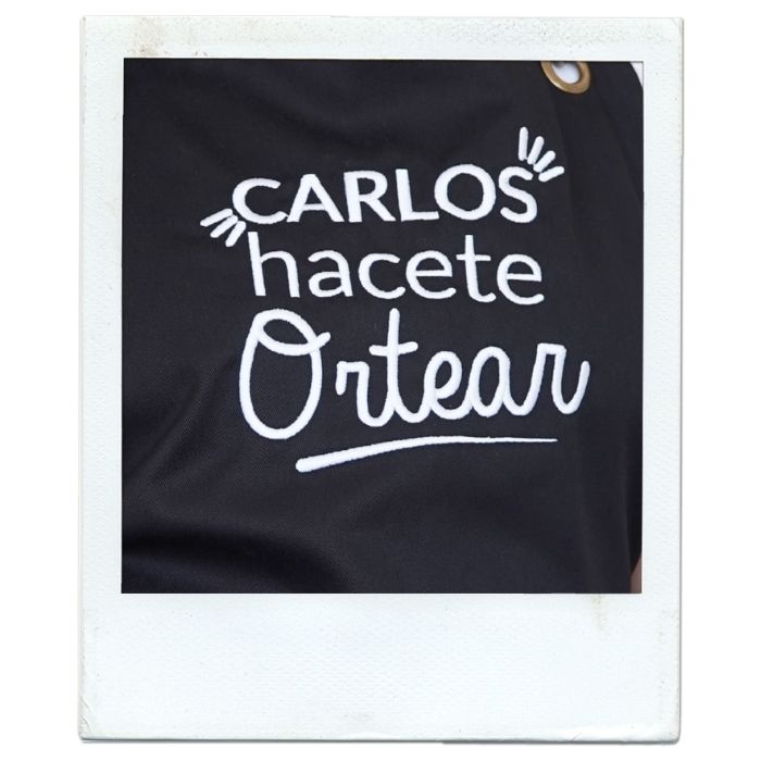 Viene en color negro con bordado en blanco y rojo. La tela es gabardina, con dos bolsillos grandes a los costados. Correas mochileras en color negro, ajustables con gancho en la pechera.